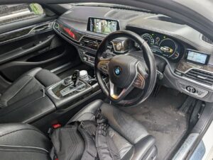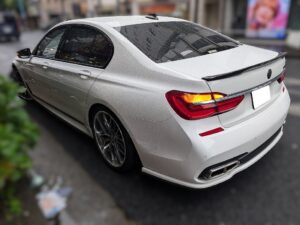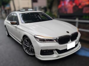サンルーフ付き、右ハンドルのH28式、BMW740iのドレスアップカーです。エンジンや足回りはノーマルで、社外エアロ、ウェッズの21インチホイールを履いています。走行距離が10万㎞を超えていますが内外装、機関の程度が良い車のため、ドレスアップした価値を含め高価買取できました。